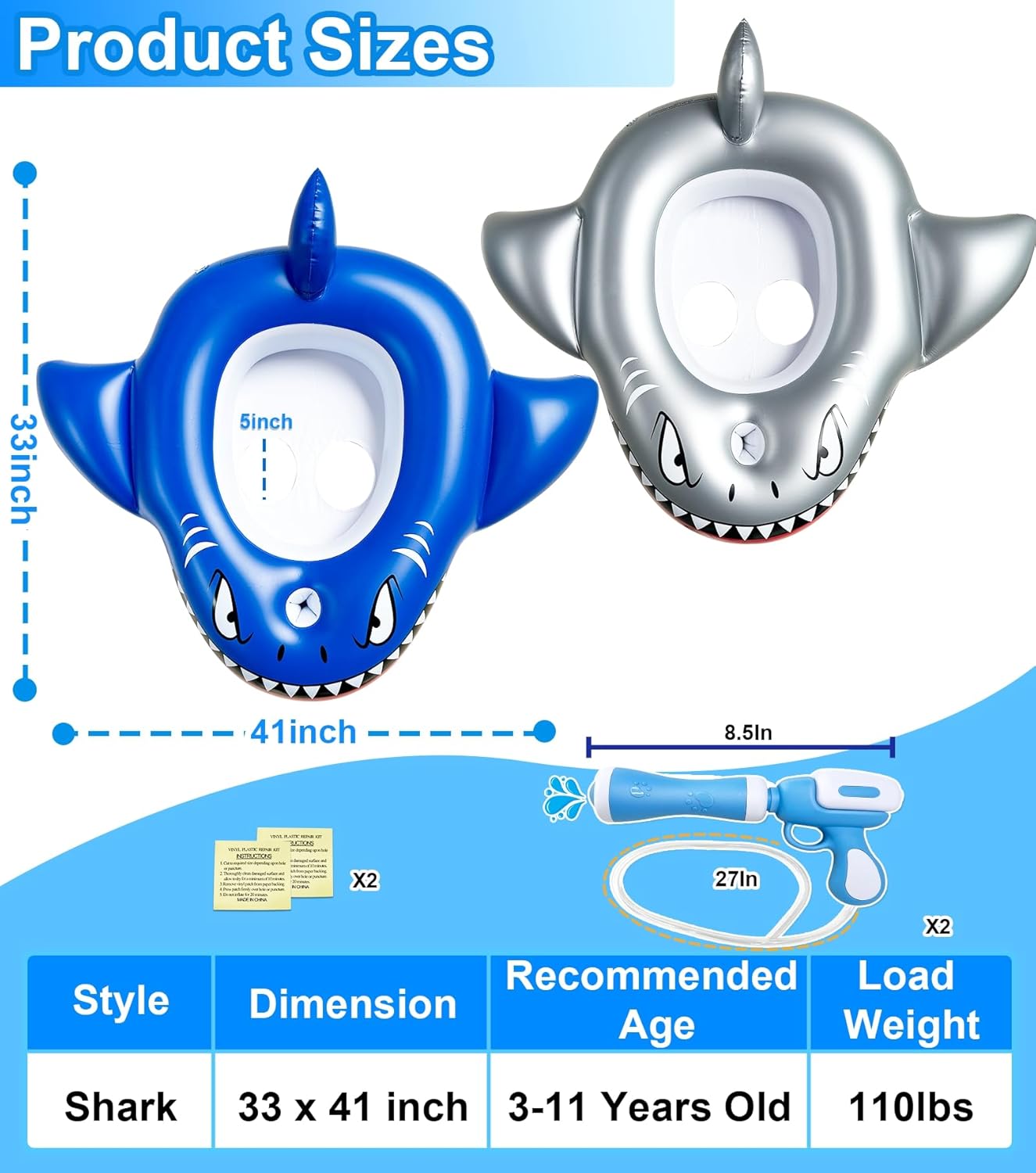2 Pack Shark Pool Float For Youngsters With 2 Water Weapons: The 2-player water recreation have to be very enjoyable; Consists of 2 shark-designed (Two colour: blue, silver) inflatable battle pool floats, 2 water squirt weapons; Notice: Kids should use it beneath parental supervision