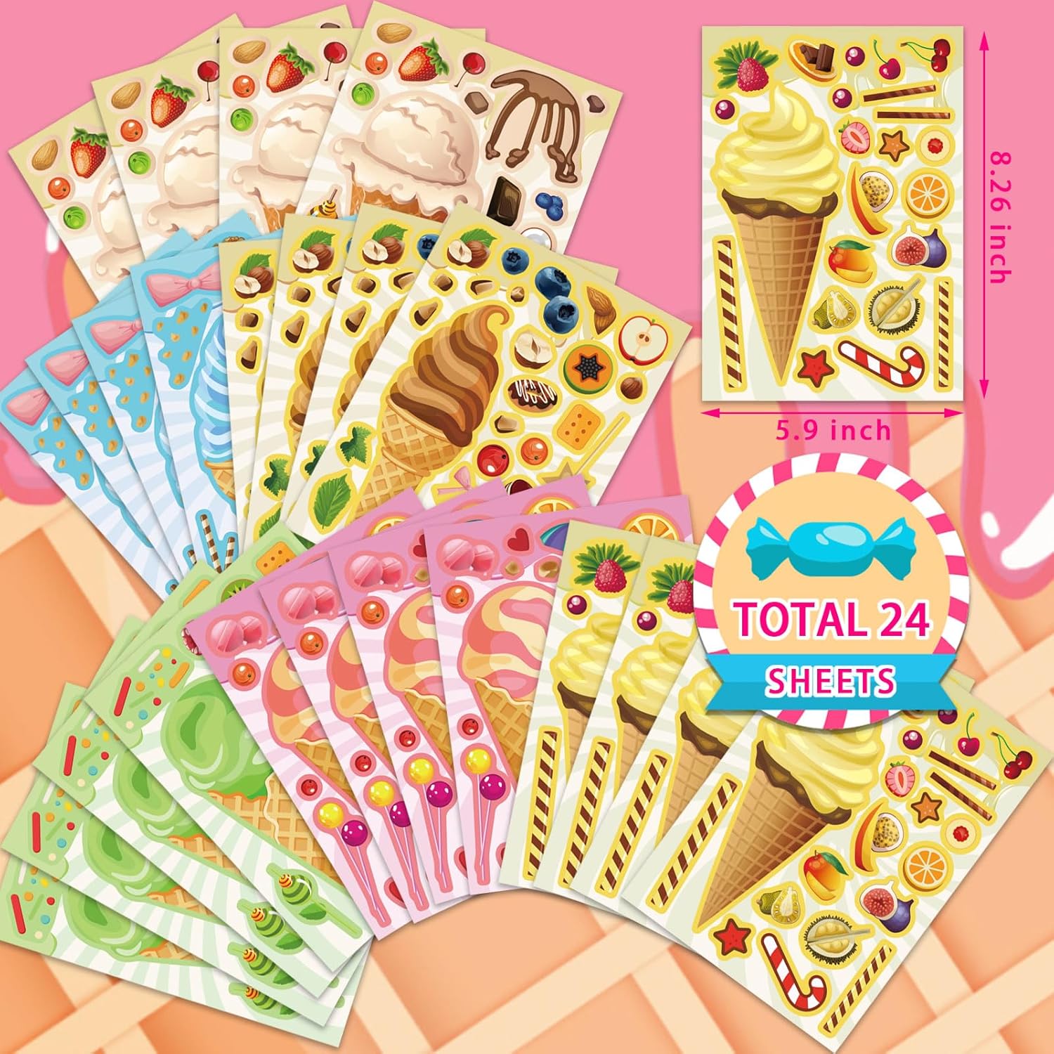 🍦🍫【Make Your Personal Ice Cream Stickers for Children】You’ll obtain 24 ice cream stickers(measurement:8.26 x 6 inch), 6 sorts of cute designs!Stuffed with scrumptious meals components akin to Chocolate, hazelnuts, sweet, walnuts, strawberries, blueberries, cherries, kiwi, durian and extra!