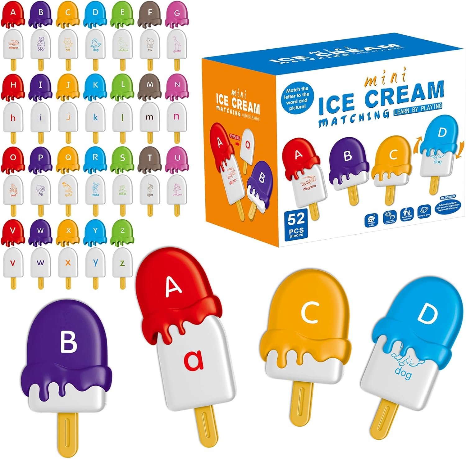 【Enjoyable Alphabet Matching Recreation】 Every ice-lolly is double-sided.On one aspect are lowercase letters, and on the opposite aspect are patterns and phrases.It successfully helps little ones grasp the idea of matching uppercase and lowercase letters with delight and ease.