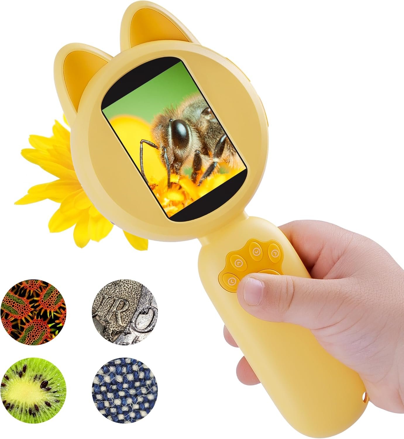 Mia Microscope for Children, Mini Digital Microscope with 2” IPS Display, Handheld Mini Scope Academic Science Toy Package, Christmas/Birthday Presents for Children Aged 3-6,7-12 (Yellow)