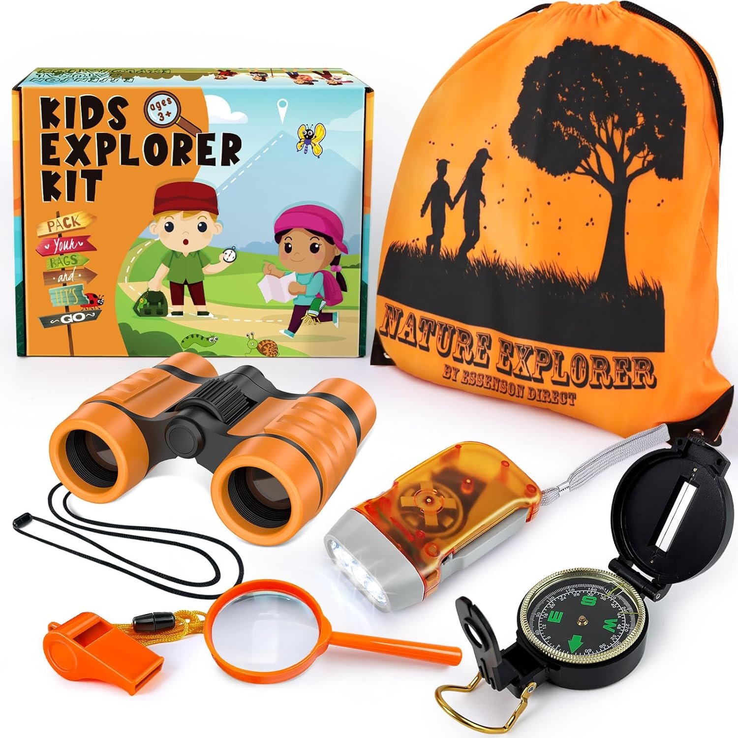 Full children explorer equipment contains: Binoculars, magnifying glass, hand crank flashlight, whistle, backpack, the compass that helps STEM studying and encourages scientific exploration and a love of nature.