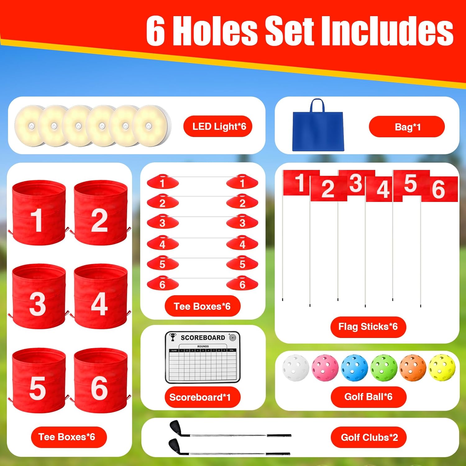 【COMPLETE SET】:Our golf recreation set comes with golf equipment and consists of all the pieces you want for an thrilling recreation: 6 LED lights, 2 detachable golf equipment,6 bucket holes, 6 tees, 6 spherical toppers, 6 flags, 6 balls, 1 scoreboard, and 1 storage bag for simple transportation. Benefit from the recreation of golf anytime, day or evening with this complete set for out of doors patio play.
