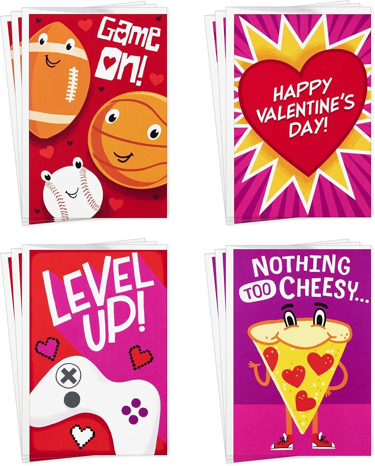 Sports activities design reads: “Hope your Valentine’s Day is a winner!” inside; Completely happy Valentine’s Day lettering design: “Make it epic;” pizza design: “Only a want for a fantastic Valentine’s Day!”; and online game design: “You personal the enjoyable this Valentine’s Day!”