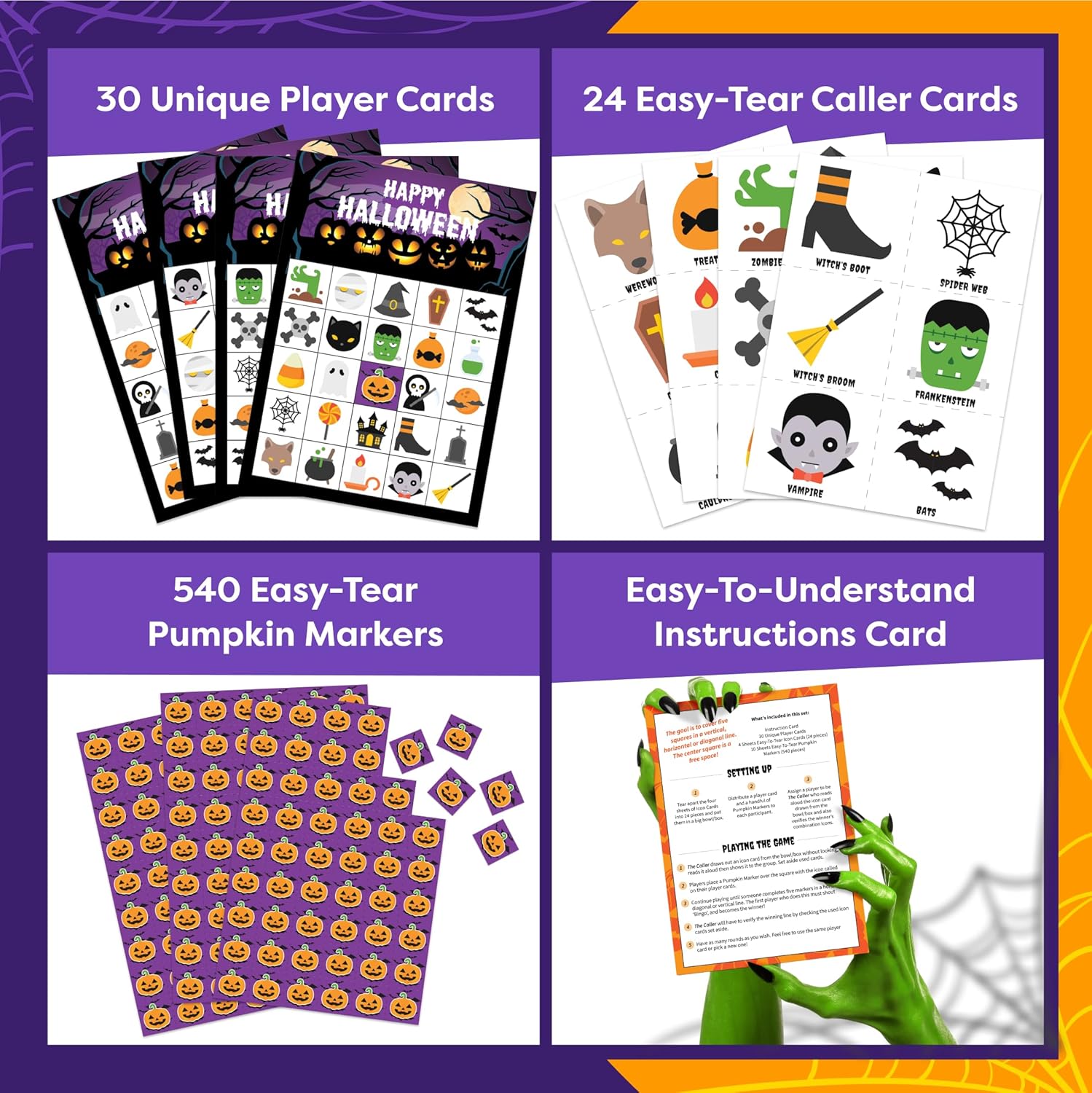 Full Halloween Bingo Card Set. Halloween Child Video games comes with 30 distinctive participant playing cards, 144 caller playing cards with 24 designs, 540 pumpkin markers, sealable polybag & an easy-to-follow instruction card for pals & household to take pleasure in. Caller playing cards & pumpkin marker sheets have handy perforated strains which might be straightforward to tear with precision.