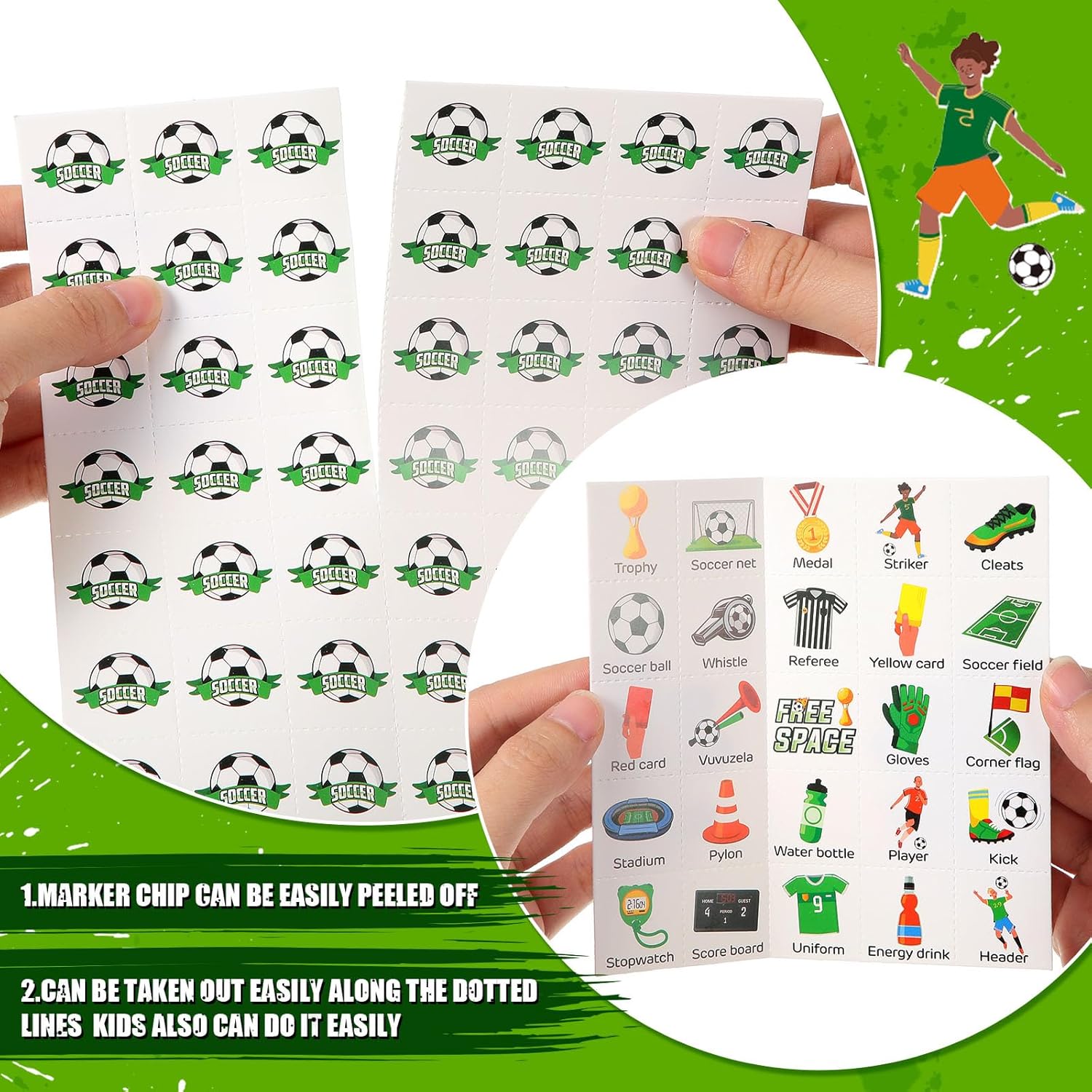 Soccer Bingo Sport Set: you’ll obtain 24 bingo participant playing cards (24 totally different patterns per card), 10 marking playing cards (56 items of chips per card), and a calling chip; It helps sufficient individuals to play collectively; Interact with your loved ones and pals on this exhilarating get together recreation and create unforgettable reminiscences collectively