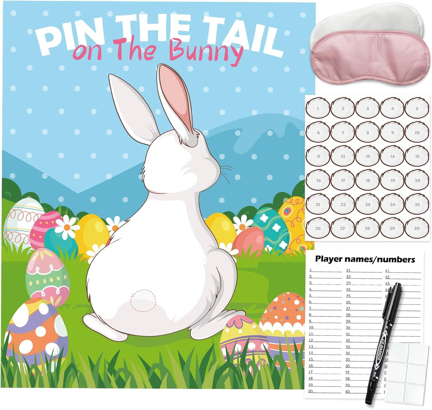 EASTER PIN GAMES – Contains Easter occasion poster(16.5×20.5 inch), ‘tail’ stickers for 30 visitors, white and pink blindfold, 6pcs adhesive tape, file card and pen.