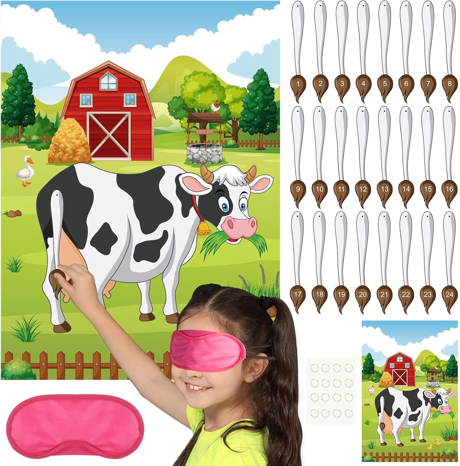 Bundle contains: 1pcs cow poster, 1pcs cow sport card, 24pcs cow tail stickers, 1pcs blindfold, 1sheet dot stickers. Classroom household actions, birthday celebration video games, favors farm animal decorations