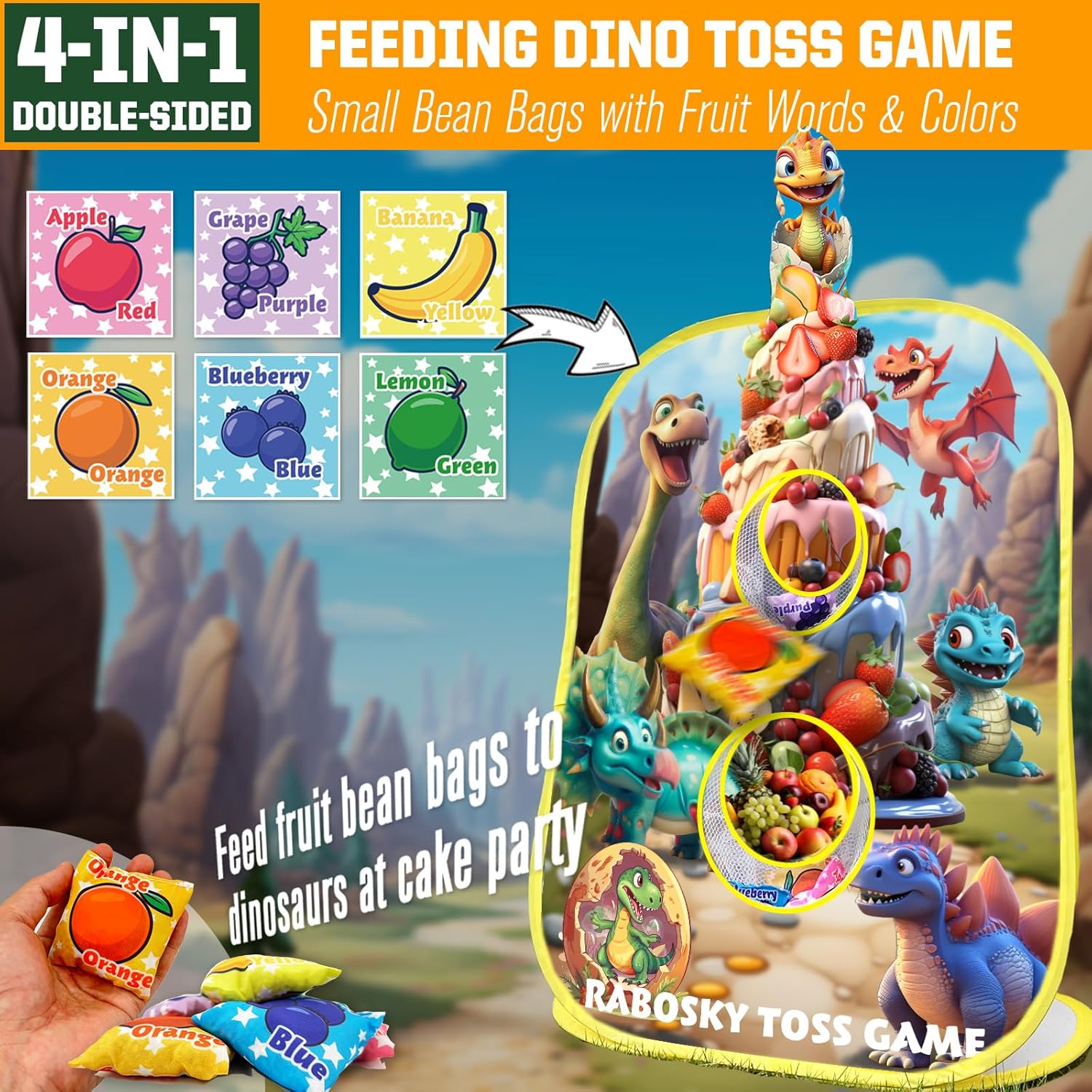 4-in-1 Larger Double-Sided Dinosaur Toss Recreation: Get pleasure from bean bag toss, ring toss, axe throwing and sticky ball toss at hungry dinosaurs in large 20 x 28in cornhole set. The upgraded design presents a number of gameplay for youths 3-5-7