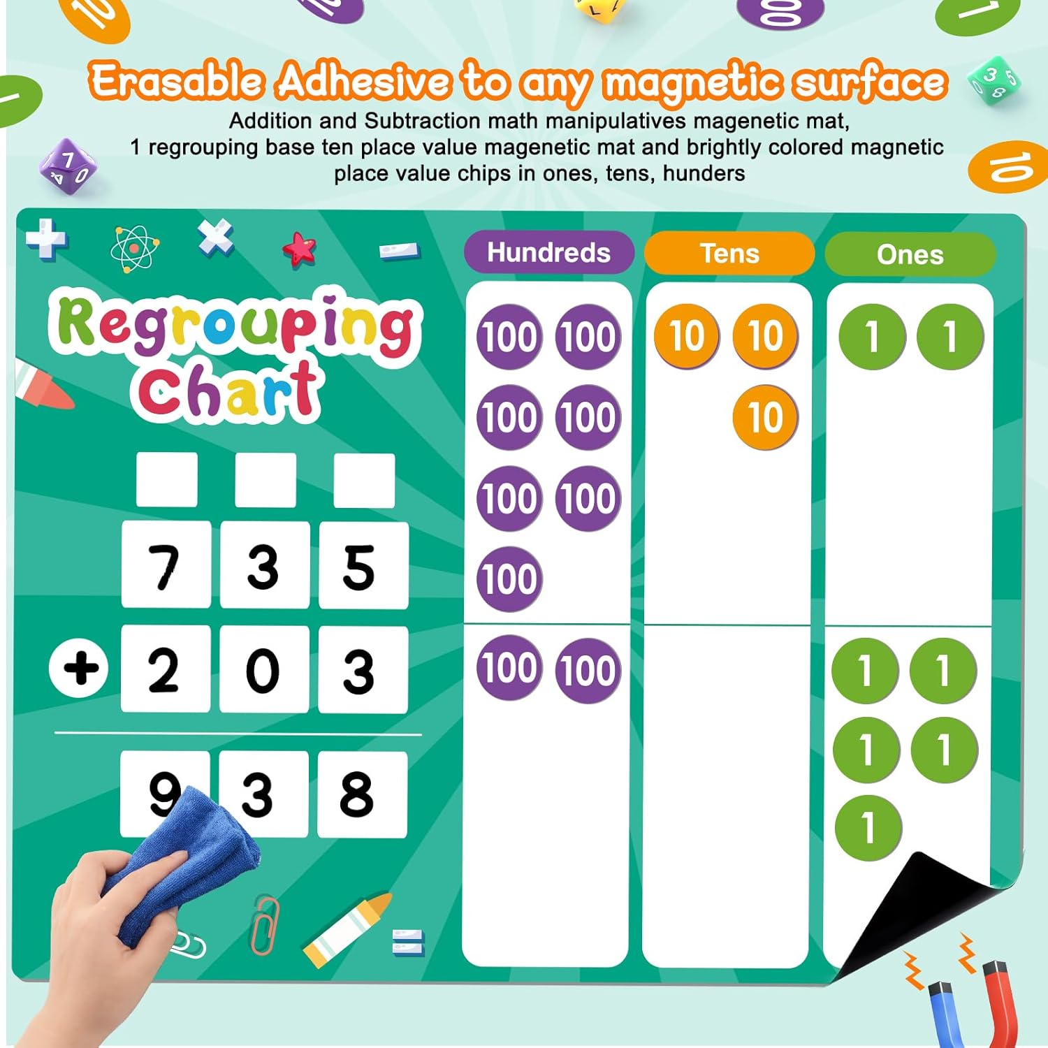 MAGNETIC REGROUPING ACTIVITIES KIT:Completely 66pcs, Embody 1 Addition and Subtraction math manipulatives magnetic mat, 1 regrouping base ten place worth magnetic mat and brightly coloured magnetic place worth chips in ones, tens, hundres(with inexperienced, yellow and purple coloration ), 1 dry erase marker, 3 dices. The bottom ten math manipulatives package with strongly magnetic. Useful gizmo for educating math.