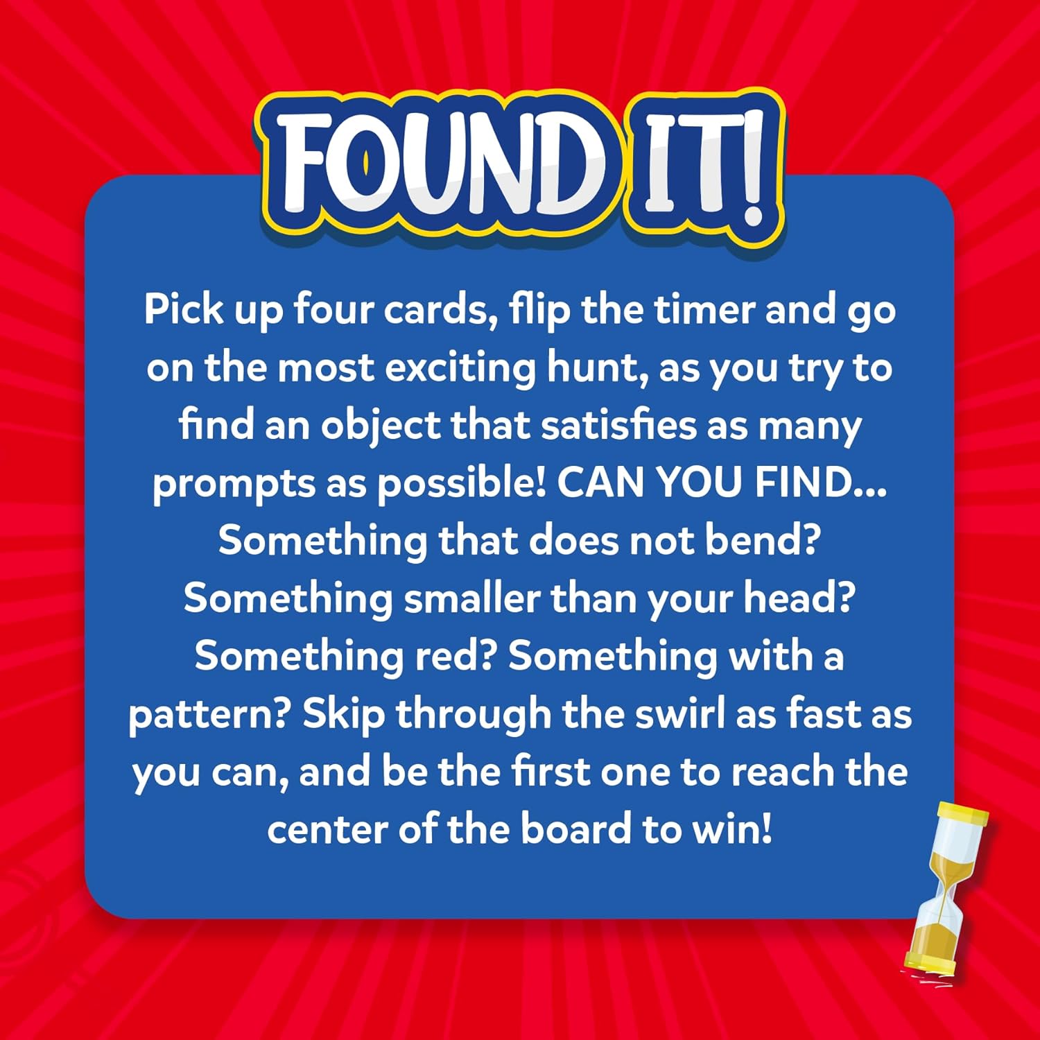 SMART SCAVENGER HUNT: Discovered It! is an thrilling board sport that helps kids study as they go on essentially the most thrilling hunt with prompts like “Can you discover..One thing that doesn’t bend? or One thing smaller than your head?” Gamers shout “FOUND IT!” as quickly as they discover the article! The primary one to succeed in the middle of the board wins the sport!