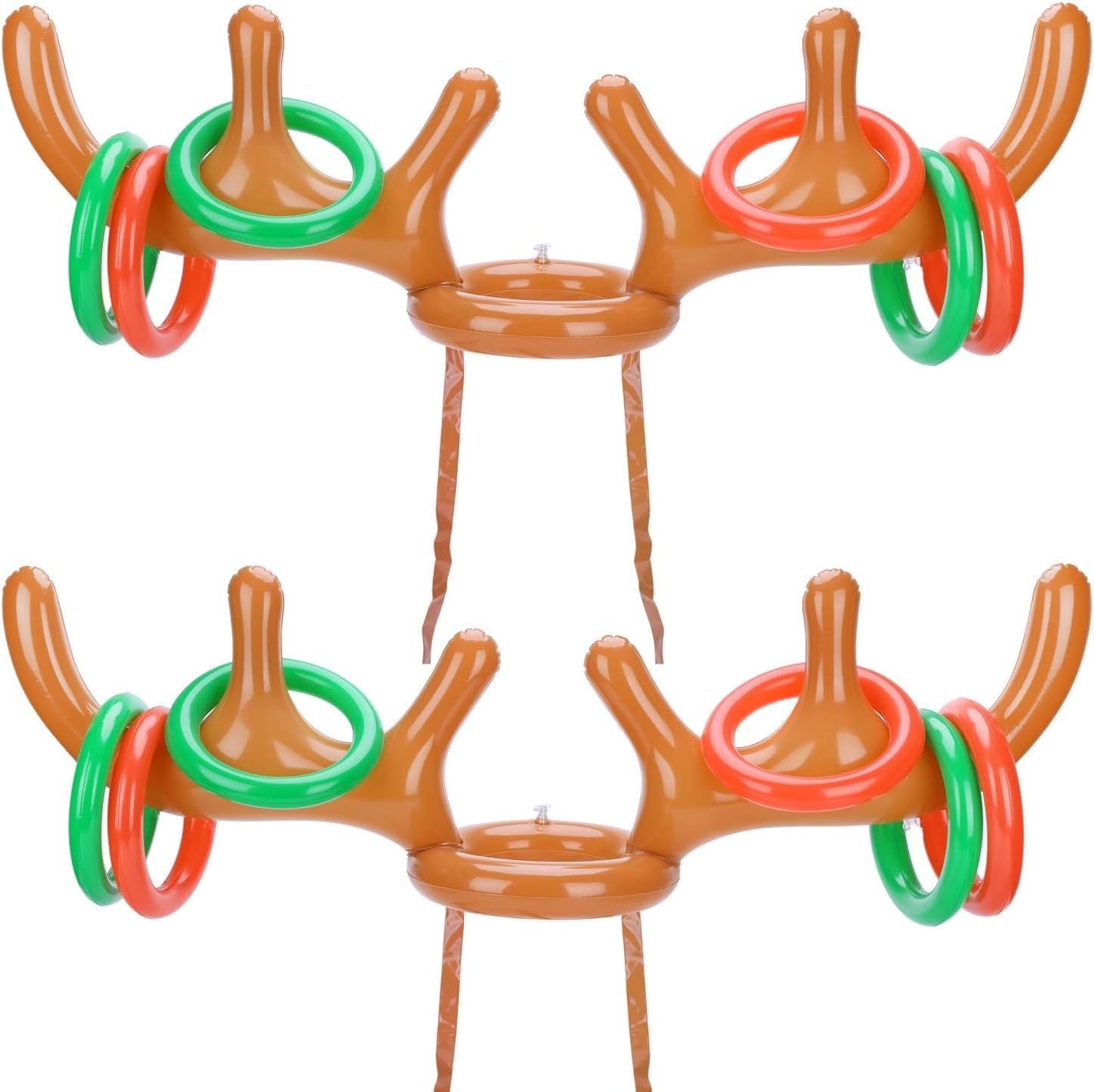 【CHRISTMAS TOSS GAME KIT】Tremendous Invaluable Reindeer Ring Toss Sport. Pack embrace: 2 Inflatable Reindeer Antler Hats with chin Strap,simple to put on; 12pcs Giant Inflatable Rings(6pcs purple+6pcs inexperienced).Extremely beneficial that blow straight together with your mouth!!!simply throw the rings to catch the Reindeer !
