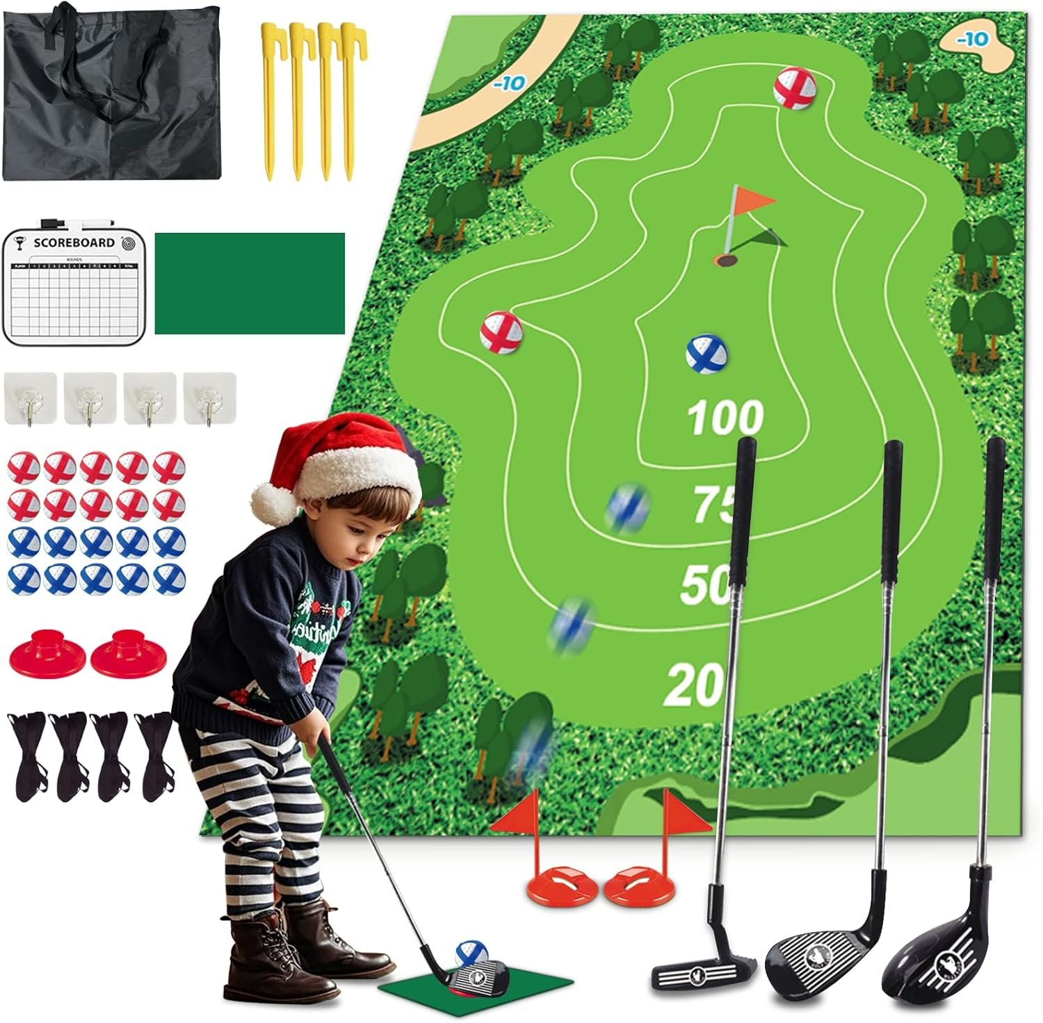 Golf Chipping Sport Set : The Chipping Golf Mat Set is an indoor and out of doors golf recreation for household, pals, youngsters. Golf video games set contains: 47.2″ L X 59″ chipping golf mat, 3 x Golf golf equipment, 20 x sticky balls, 1 x chipping mat, 4 x floor stakes, 1 x storage bag, 4 x clear hook, 2 x tee, 1 scoreboard with pen.