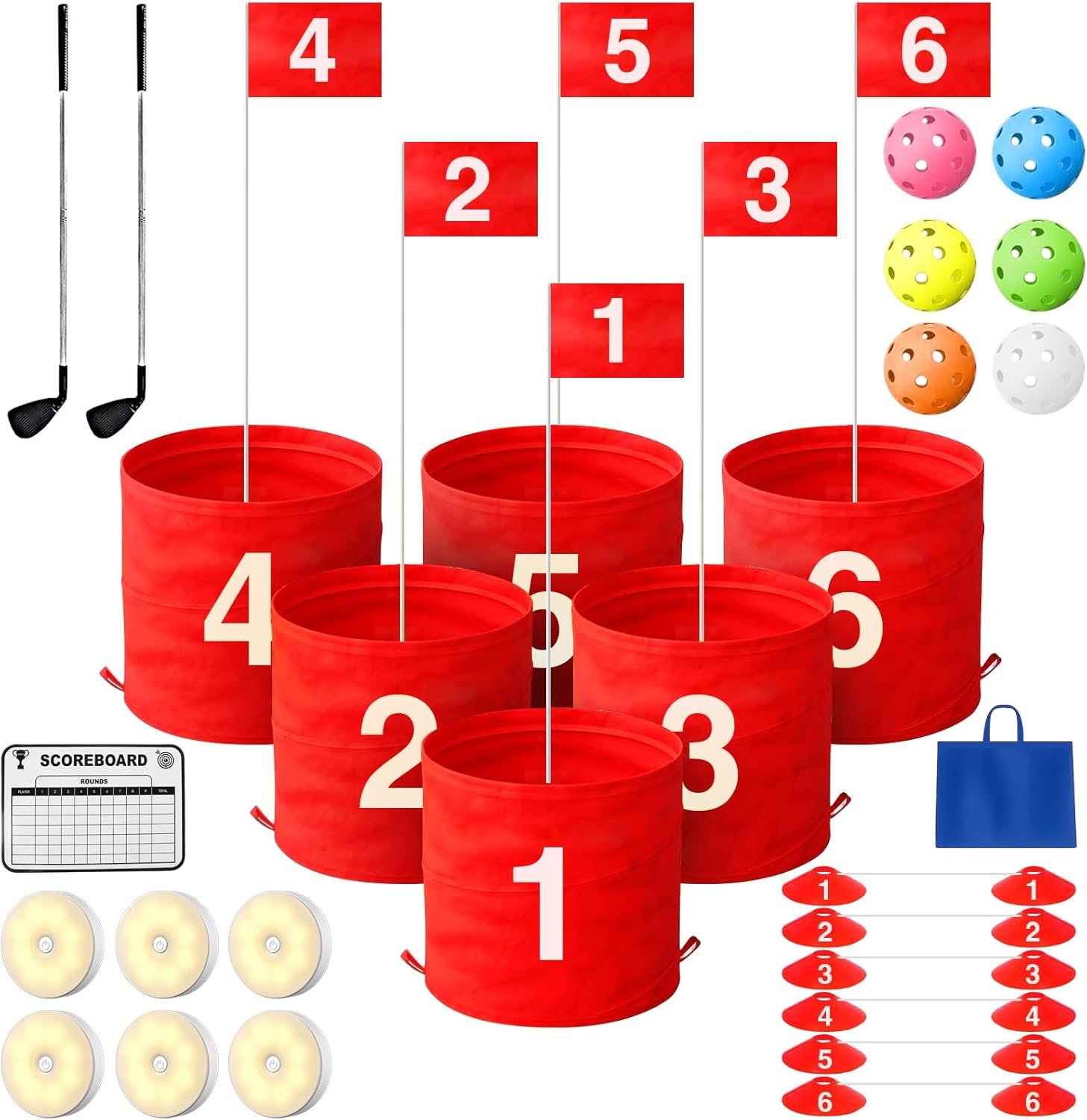 【COMPLETE SET】:Our golf recreation set comes with golf equipment and consists of all the pieces you want for an thrilling recreation: 6 LED lights, 2 detachable golf equipment,6 bucket holes, 6 tees, 6 spherical toppers, 6 flags, 6 balls, 1 scoreboard, and 1 storage bag for simple transportation. Benefit from the recreation of golf anytime, day or evening with this complete set for out of doors patio play.