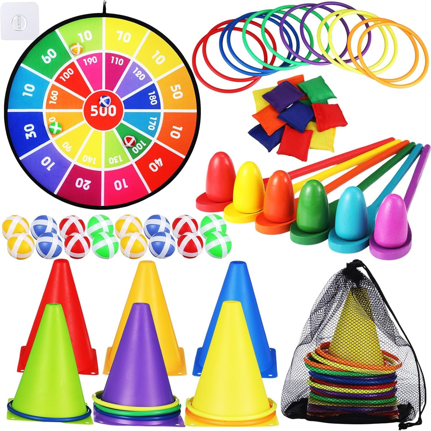 3 Units of Video games: together with 1 set of dart video games, 1 board, 12 balls and 1 hook, 1 set of relay video games, 6 wood spoons and 6 wood eggs, 1 set of throwing video games, 6 plastic cones, 12 bean baggage, 12 rings and 1 internet bag, adequate amount, numerous types
