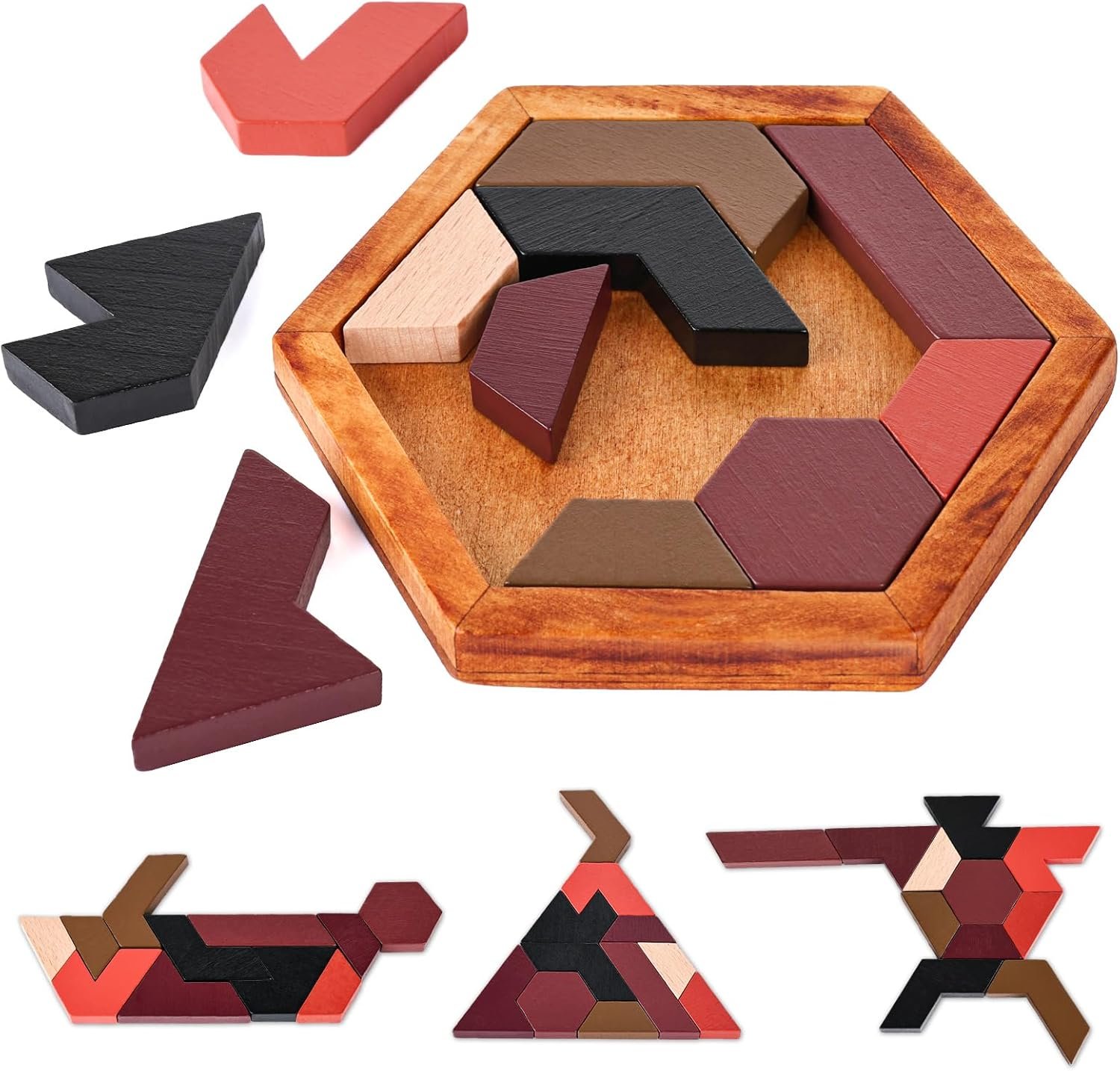 3 otters Hexagon Tangram Puzzle, Wood Mind Puzzles Difficult Wood Mind Teasers Puzzle Video games Mind Video games for Children Household Celebration Present, Christmas Stocking Stuffers