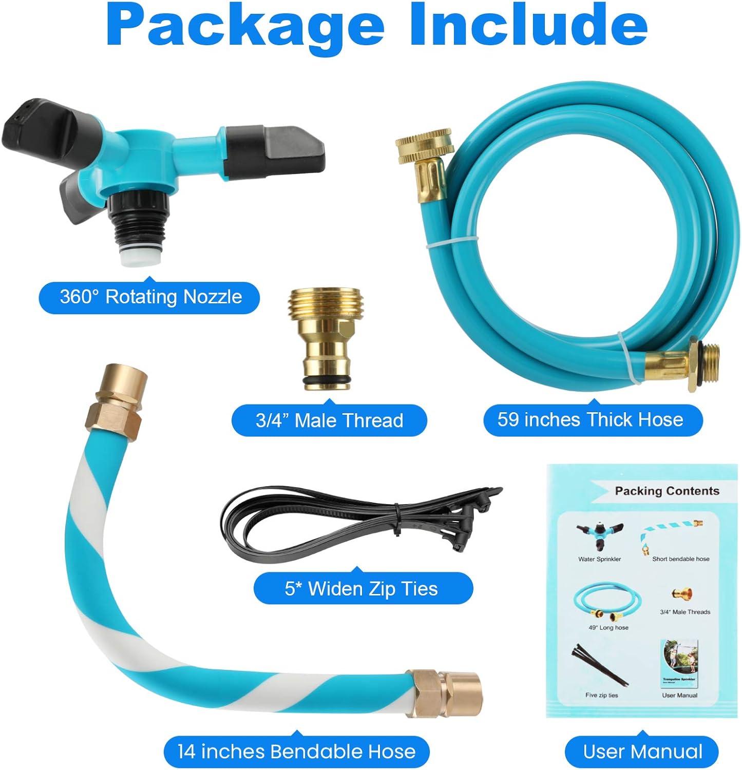 Set up in Minutes: Set up the three-arm sprinkler with the opposite two hoses, join with a backyard hose, and stuck to the highest of your trampoline poles with the included zip ties. The Blue-white stripe connecting hose is made from copper, might alter the angle at will. It match all customary trampoline poles: straight pole, curved pole, angled pole, or arch pole enclosure poles.