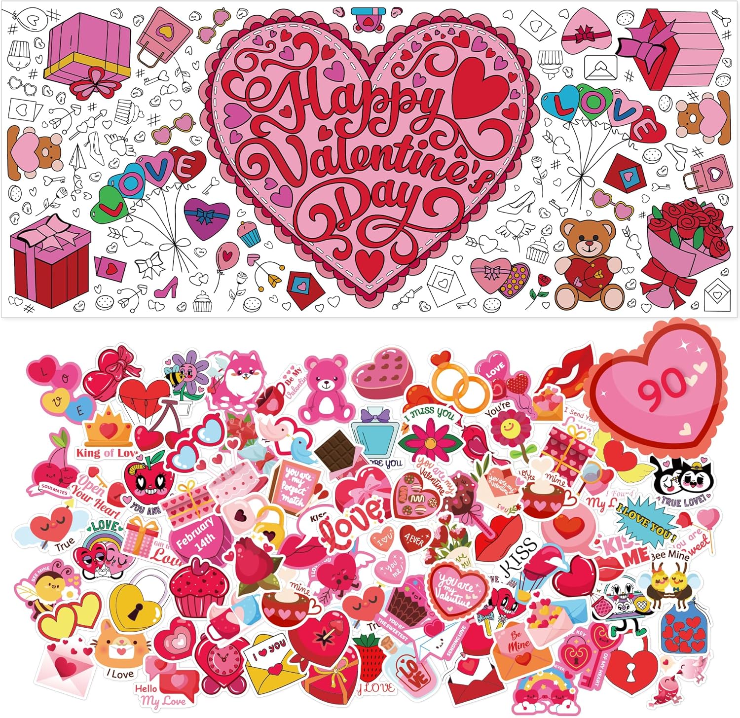 Valentines Day Items for Children Classroom College – 181 PCS Stickers With Big Coloring Poster – Decorations, Decor Crafts, Treats Backdrop, Celebration Favors