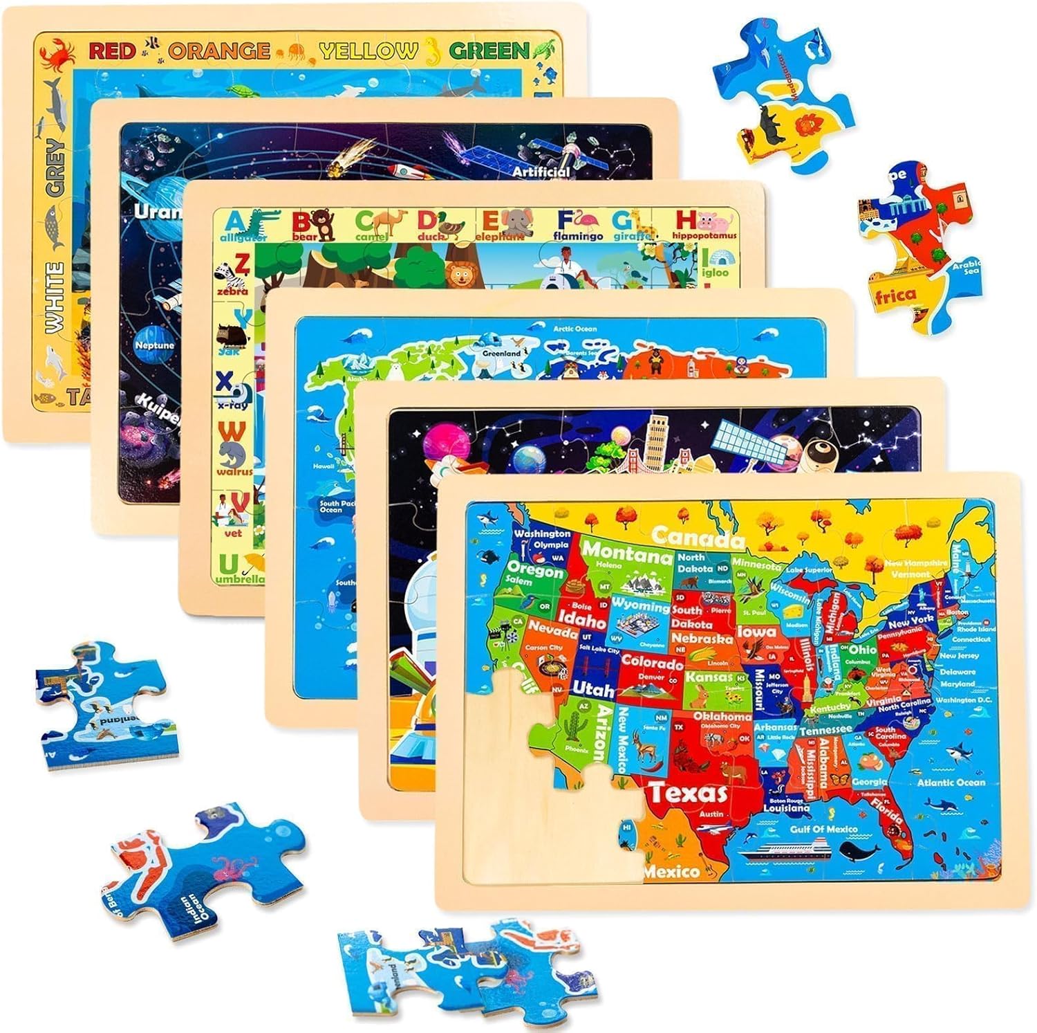 Wood Puzzles for Youngsters : The wood world map puzzles for teenagers consists of 6 packs of 24 sturdy wood puzzles items to point out 6 totally different interesting instructional themes of states , world map, photo voltaic system, moon, alphabet and shade. This wood puzzles for toddlers set incorporates numerous cute and colourful patterns